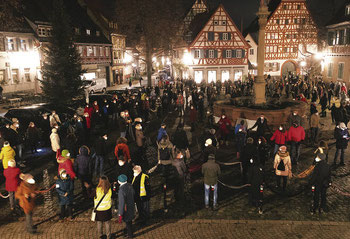 Rund 200 Menschen haben sich am Montagabend am Marktplatz versammelt, um eine Menschenkette zu bilden und ein Zeichen zu setzen gegen die etwa 50 "Spaziergänger" in der Stadt. Ihnen standen so viele Gegendemonstranten gegenüber, dass diese eher eine Spirale um den Marienbrunnen bilden mussten. Für eine Kette waren es einfach zu viele.
